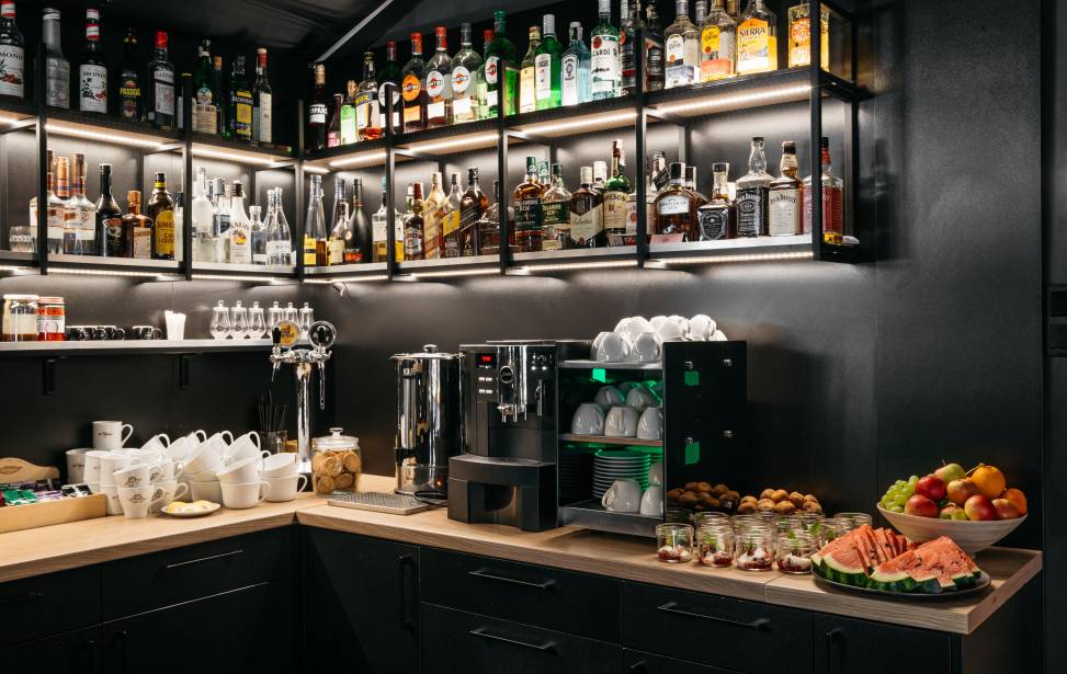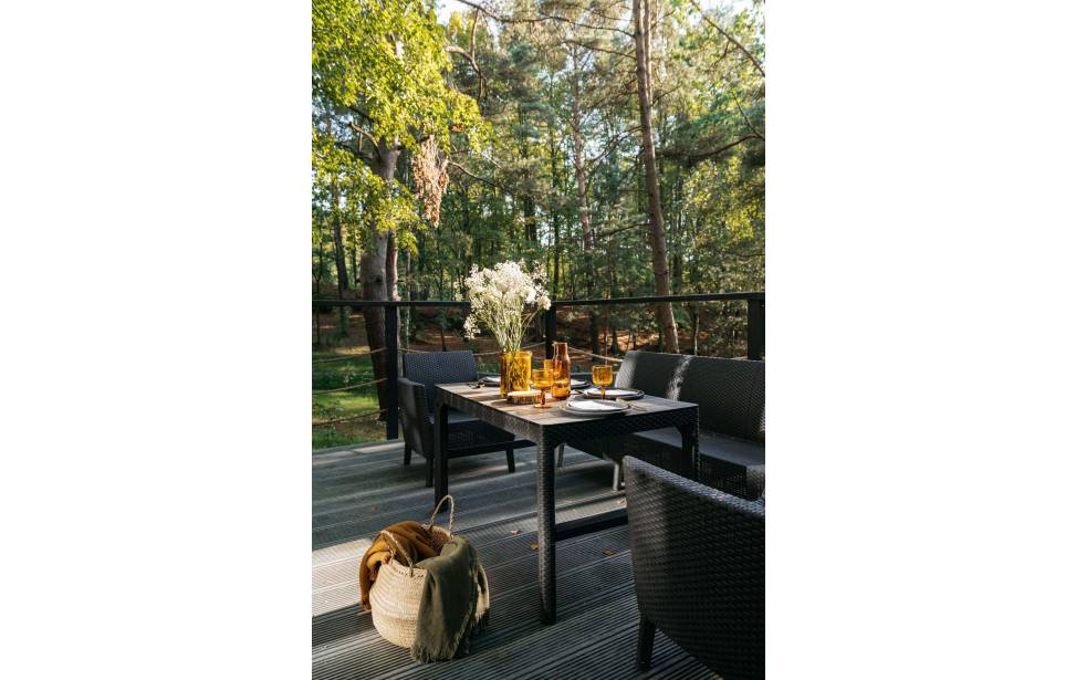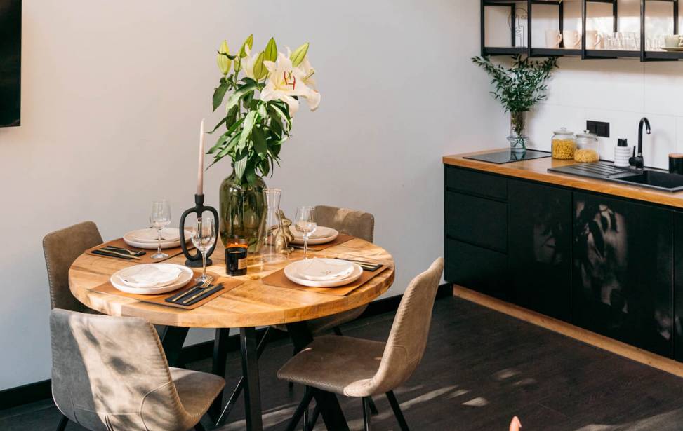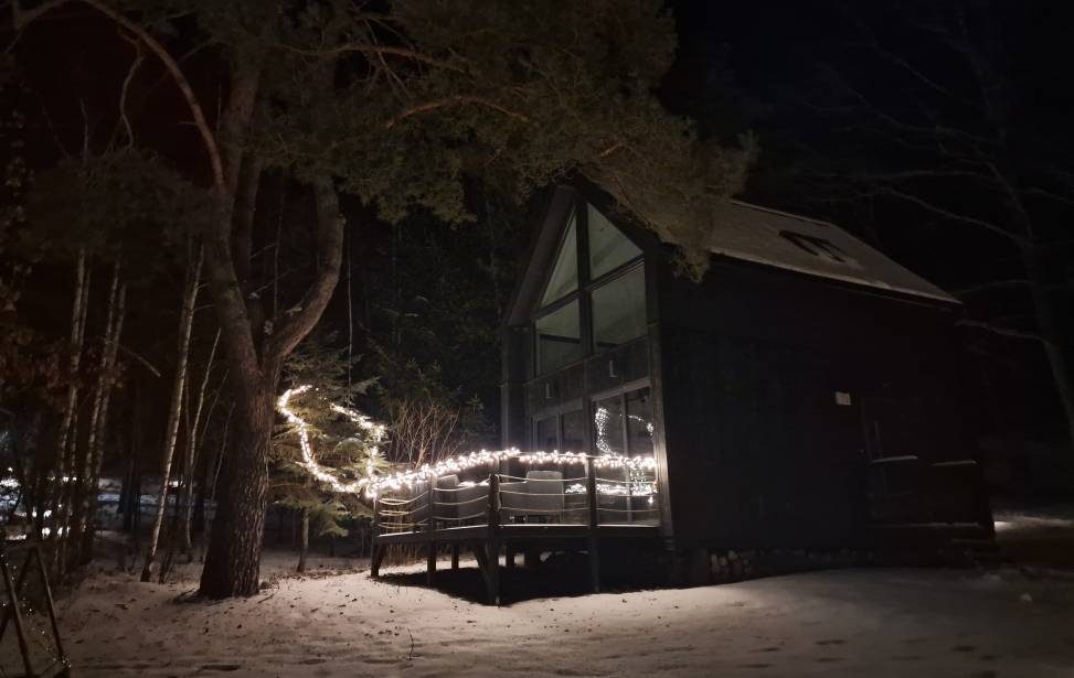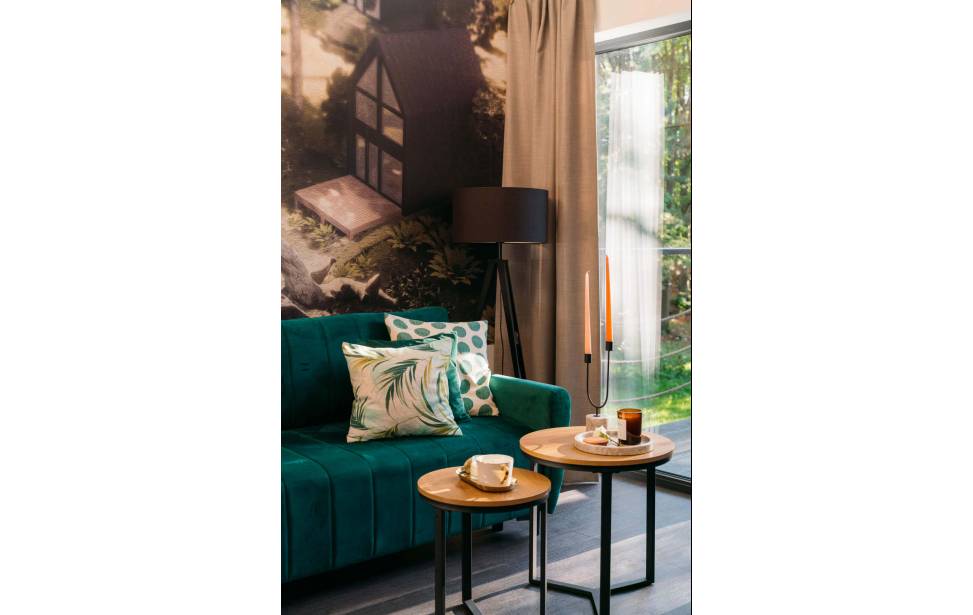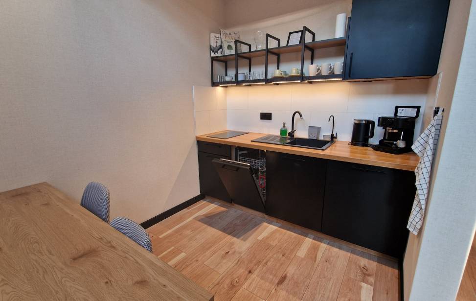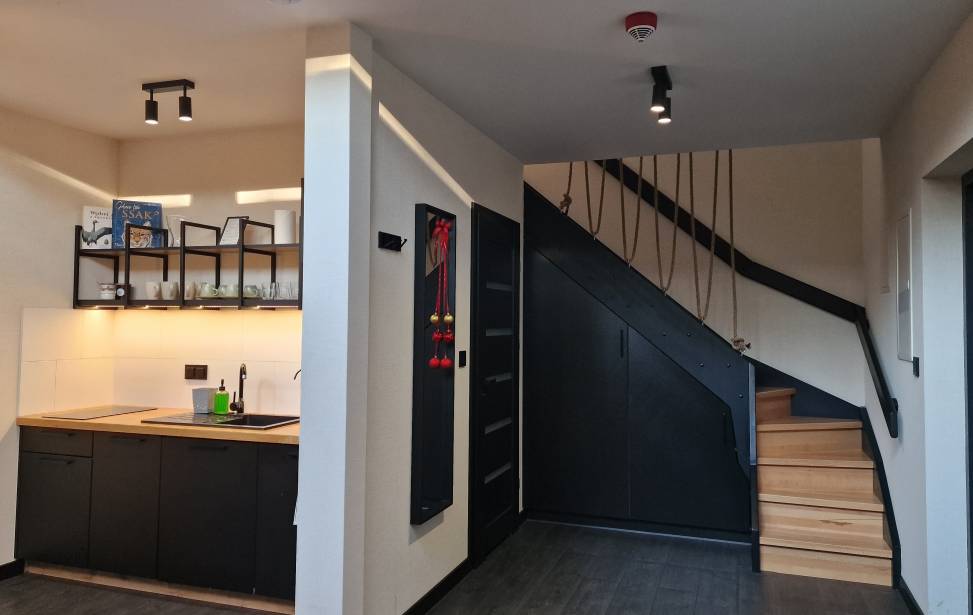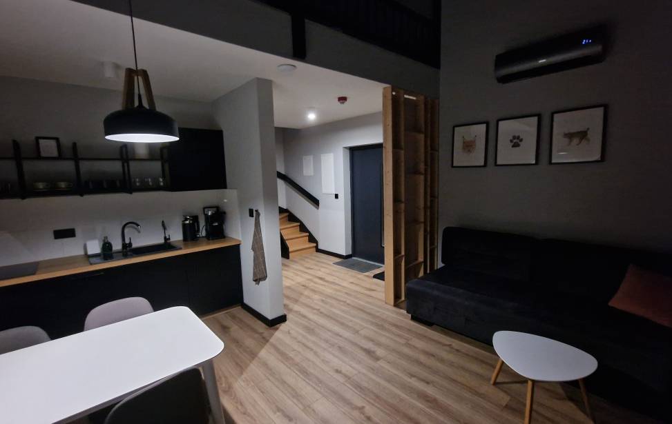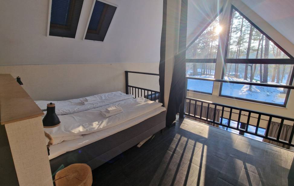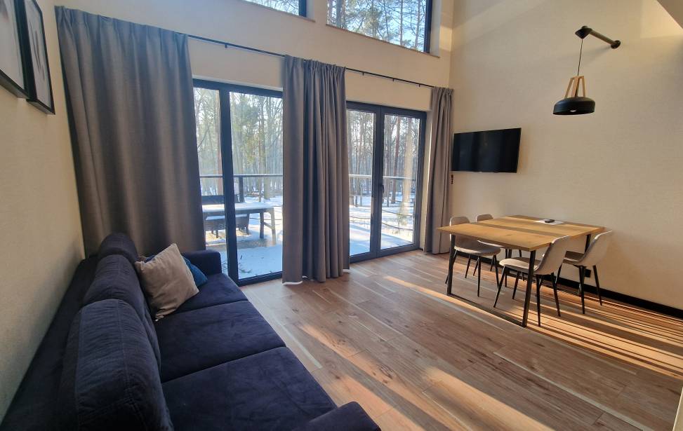 Salon z aneksem kuchennym: Wygodny salon z rozkładaną sofą i dużymi oknami z leśnym widokiem. W pełni wyposażona kuchnia (lodówka, płyta indukcyjna, czajnik, naczynia, ekspres do kawy, zmywarka, filtrowana woda) dla miłośników gotowania. Telewizor, klimatyzacja oraz ogrzewanie podłogowe w dolnej części domku.