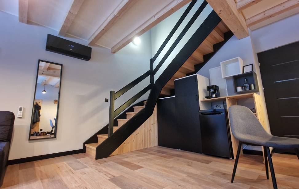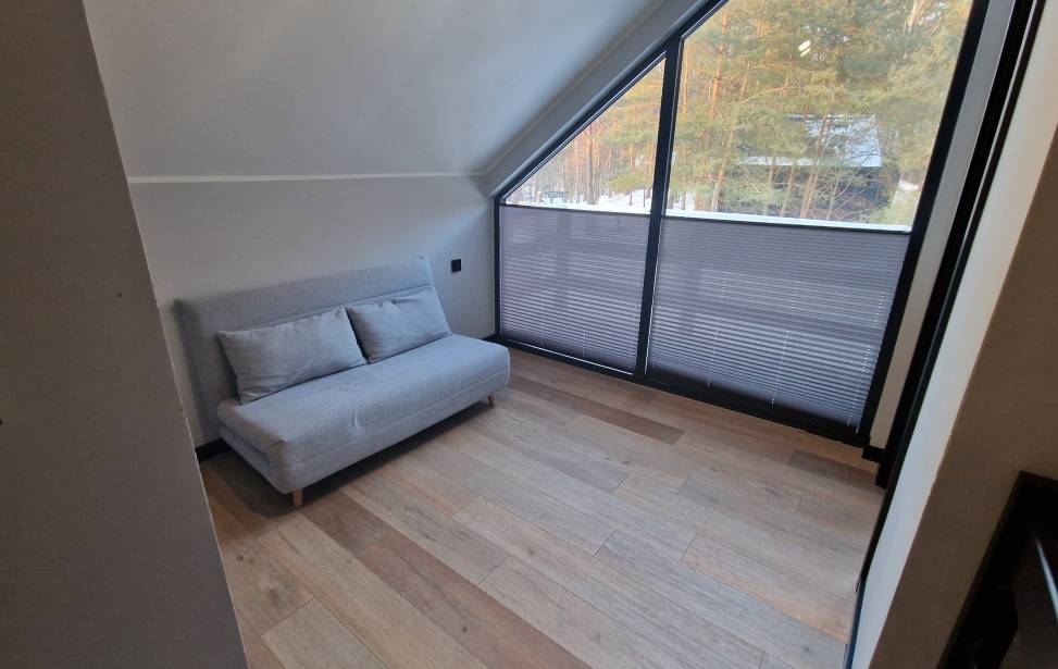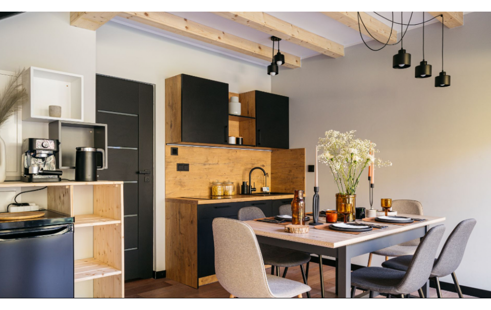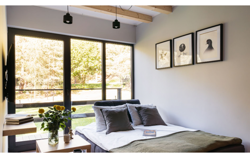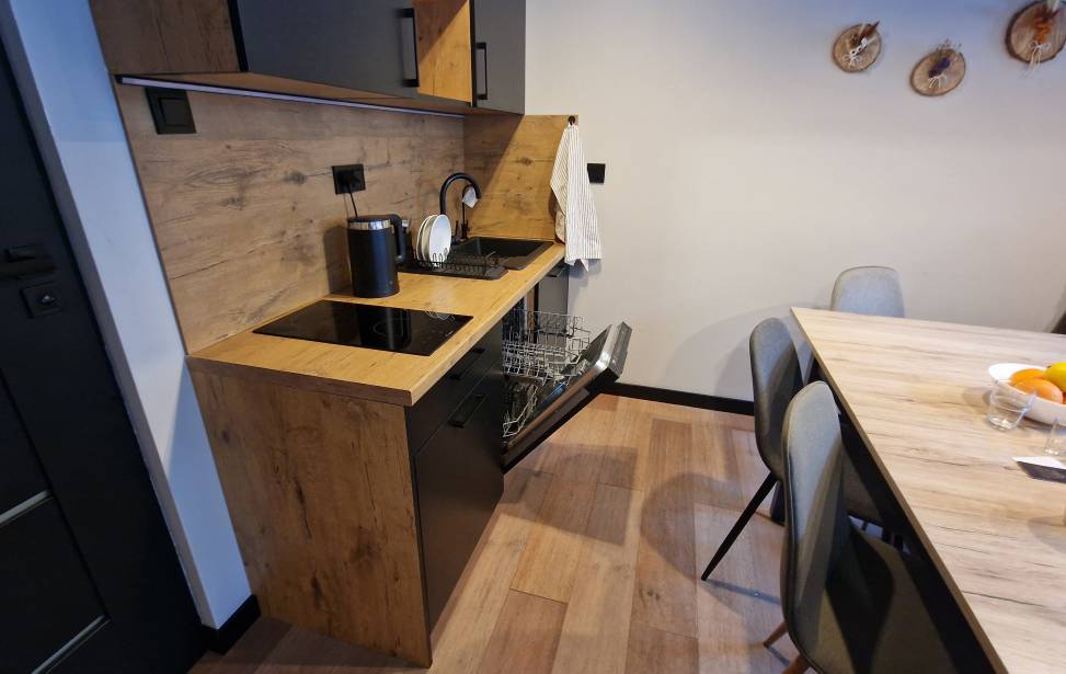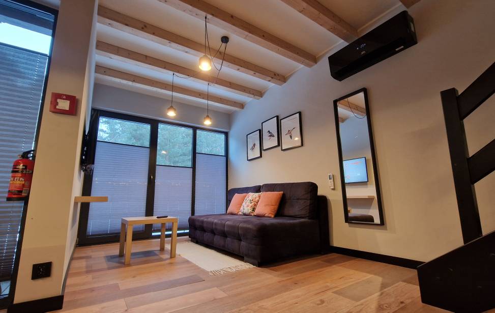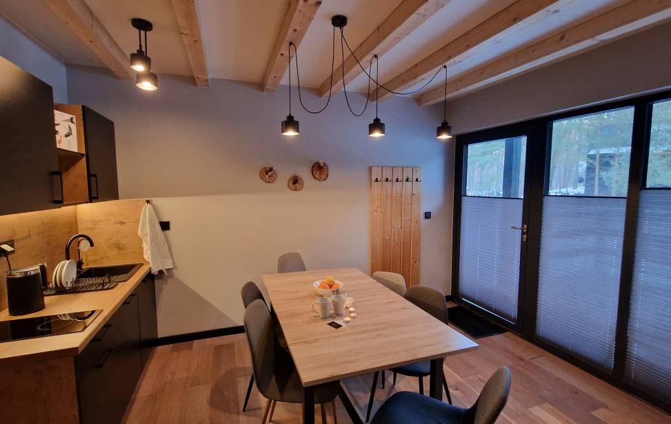 Salon z aneksem kuchennym: Wygodny salon z rozkładaną sofą i dużymi oknami z leśnym widokiem. W pełni wyposażona kuchnia (lodówka, płyta indukcyjna, czajnik, naczynia, ekspres do kawy, zmywarka, filtrowana woda) dla miłośników gotowania. Telewizor, klimatyzacja oraz ogrzewanie podłogowe w dolnej części domku.
