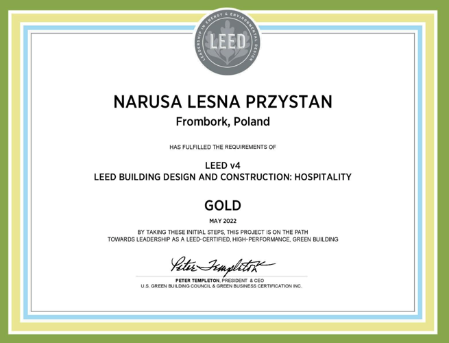 Ośrodek wypoczynkowy Narusa Leśna Przystań wypełnia wymagania LEED i otrzymał certyfikat LEED v4. LEED to program niezależnej certyfikacji oraz międzynarodowy punkt odniesienia w zakresie projektowania, budowy i eksploatacji budynków o wysokiej wydajności. LEED stwarza właścicielom i zarządcom nieruchomości możliwość wykorzystania specjalistycznych narzędzi i strategii, które bezpośrednio i wymiernie wpływają na wydajność budynków.